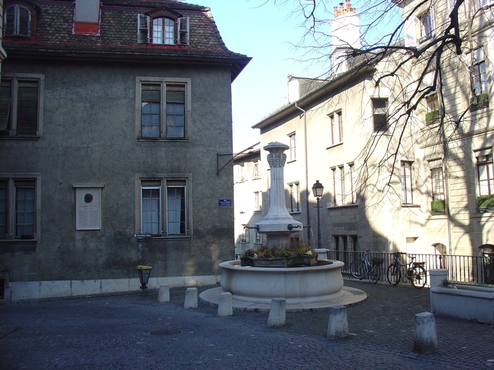 Era sábado e estava vazio e muito tranquilo, mas não é difícil imaginar a transposição dessa tranquilidade para outros dias da semana. Bairro literário – uma placa anuncia-nos que Jorge Luís Borges viveu aqui (e não muito longe dali, no cemitério des Rois, jaz ao lado de, entre outros, Calvino, Jean Piaget e Robert Musil) e a Casa de Rosseau e da Literatura também fica aqui – e cheio de galerias de arte, um bom local de partida para o explorar é a Place du Bourg de Four, a praça mais antiga de Genebra.
