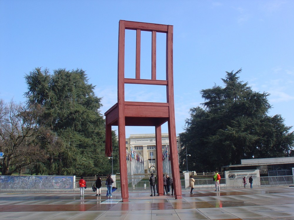 Atravessado o Jardim Botânico chegamos, enfim, ao quartel general da ONU na Europa. A escultura que Daniel Berset fez, em 1997, para a ONG Handicap International tornou-se ela própria um símbolo de Genebra. A “Cadeira Partida” está ali mesmo em frente à ONU e do alto dos seus 12 metros lá se tenta manter erguida sobre as suas três pernas, a quarta perdida, um símbolo da luta contra as minas terrestres.