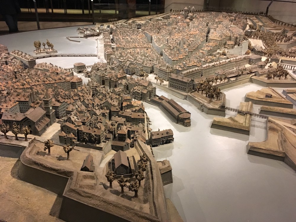Já cá em baixo, ali perto fica a Maison Tavel, a mais antiga residência privada da cidade, a qual leva o nome da família que era sua proprietária. Hoje, este edifício construído entre o século XIII e XVI, o mais antigo e o melhor exemplo da arquitectura civil apalaçada da cidade, mais parecendo, no entanto, uma fortificação com a sua torre, é propriedade da cidade de Genebra. E aqui fica um pequeno museu da história urbana e da vida quotidiana da cidade desde a Idade Média até ao século XIX, com pinturas, mapas, mobiliário e outros objectos. Mas o ponto alto é a maquete da Geneva de 1850. Se da torre da Catedral de St Pierre podemos apreciar a Genebra de hoje, com esta maquete fantástica ficamos a conhecer como era Genebra antes da destruição das suas muralhas em 1850.