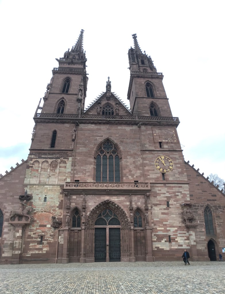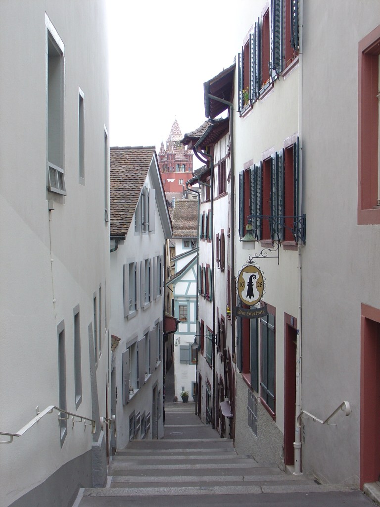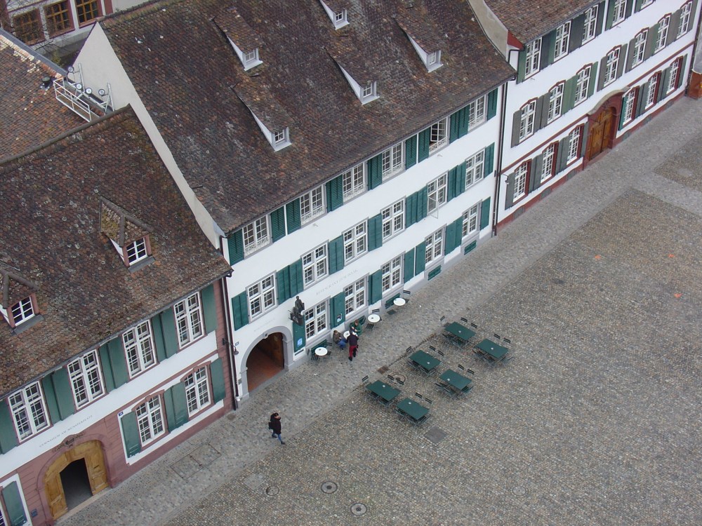 Após visitarmos o interior da igreja, cuja construção teve início no século XI e continuou até ao século XV, em estilo romanesco e gótico, podemos subir às suas torres. É difícil não nos perdermos na subida a cada uma das torres gémeas, mas a vista que daqui se tem causa-nos, ela própria, muitas mais sensações. Vemos o Reno logo ali, a praça deserta e o esquisito telhado do Museu da Cultura, projecto de Herzog & de Meuron.