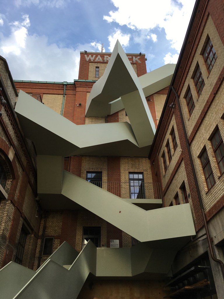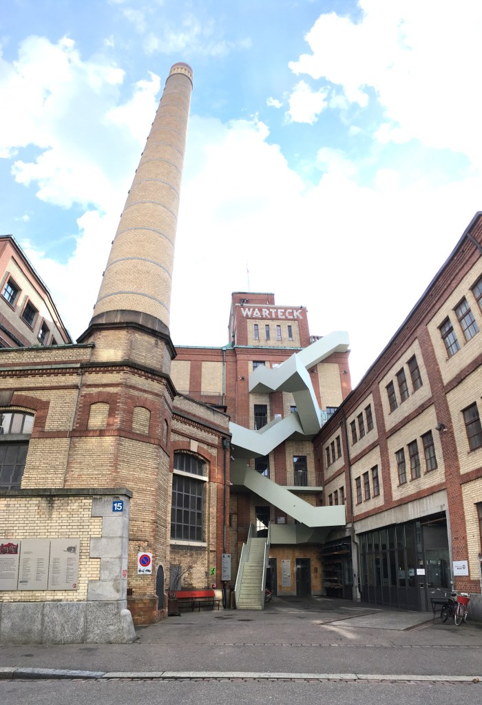 E para completar este périplo por alguma da arquitectura moderna e contemporânea de Basileia, um exemplo de restauro de um edifício industrial, também aqui na Kleinbasel, que é demonstrativo deste gosto pelo arrojo arquitectónico que se vê amiúde na cidade. O Warteck era uma antiga fábrica de cerveja. Construído à beira do Reno em 1900, este edifício em tijolo possuía – e mantém – uma enorme mas distinta torre / chaminé. Para quem aprecia arquitectura industrial, era já um edifício interessante. Quem admira as dinâmicas ligadas à requalificação e reutilização destes antigos edifícios, vai achá-lo precioso. É agora um espaço de coworking com diversas funções, incluindo projectos culturais. Esta capacidade de abraçar o novo e o diferente está bem expressa naquilo que visualmente é o mais apelativo no Warteck dos nossos dias: a escadaria retorcida que foi agregada à sua fachada. Desenhado por Fabian Nichele e Gerhard Paul Rössler, este novo elemento acaba por ser ele próprio uma espécie de obra de arte.