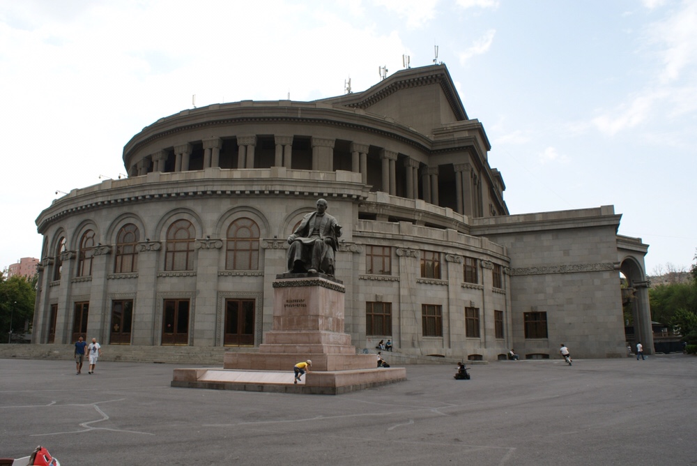 Por toda a cidade, mas aqui mais evidente, é a pedra tufa local a utilizada nas construções e a responsável pelo epíteto “Yerevan, a cidade rosa”.