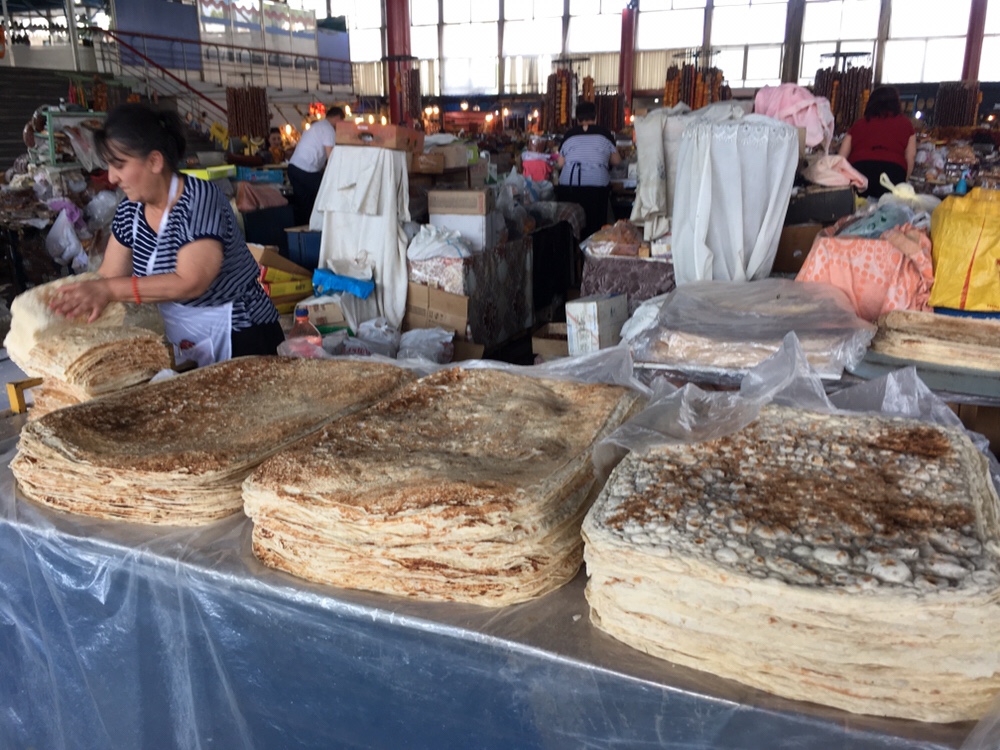 O Mercado GUM, literalmente “principal loja universal”, é o maior mercado de Yerevan, aquilo que nos tempos soviéticos era conhecido como as lojas de departamento estatais. O porte não engana, é soviético. E o ambiente no interior do mercado também não engana, não é europeu. Não que os europeus não sejam capazes daquela simpatia, de quem oferece os seus produtos de forma genuína, sem esperar obrigatoriamente que eles venham a ser comprados, antes se preocupando em dar a conhecê-los. Visualmente as frutas secas e cristalizadas em exposição, embaladas de forma peculiar, são uma explosão de cores, bem como as nozes e as especiarias. O espectáculo maior é o ritual das senhoras a fazer o lavash, o pão típico – fino e saboroso – obrigatório em todas as refeições locais. A preparação, o significado e a aparência deste pão tradicional como expressão da cultura na Arménia foi inscrito em 2014 na Lista do Património Cultural Imaterial da Humanidade.