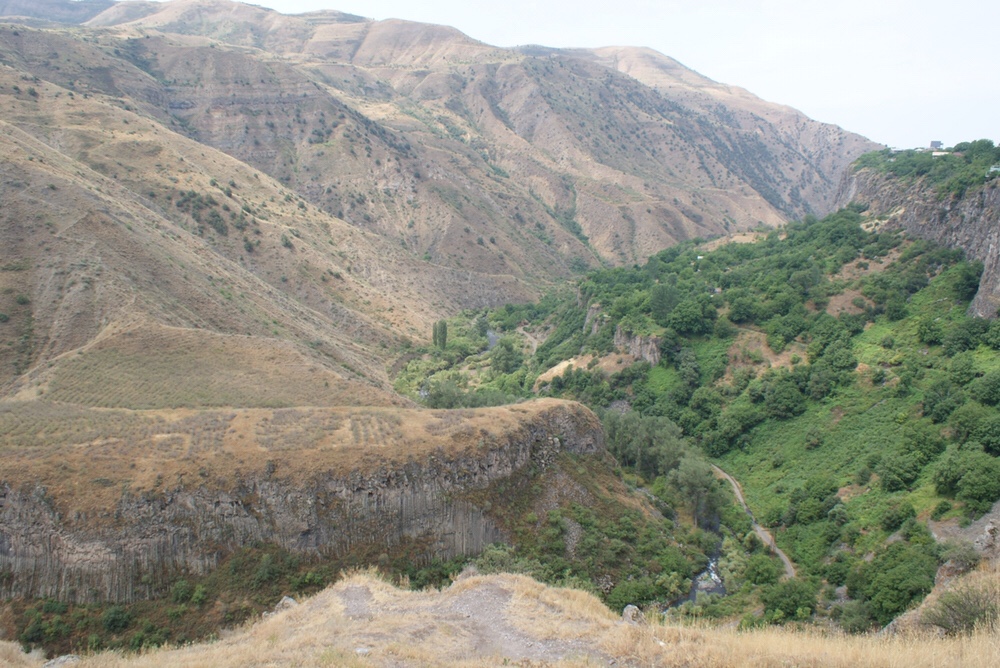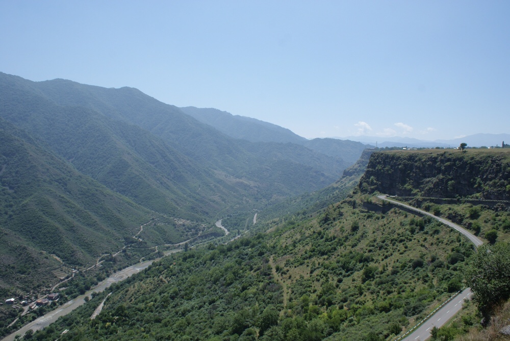 Uns bons quilómetros mais e aparece o tal desfiladeiro do rio Debed que nos acompanha por muito tempo. É a natureza em estado bruto, umas altíssimas paredes de montanhas que ladeiam um corte na terra onde o rio Debed, por vezes um fio de água, corre estreito. Esta é a estrada principal que liga a Arménia à Geórgia e o rio Debed faz de fronteira natural entre os dois países. Disse natureza em estado bruto, mas há que acrescentar que a paisagem natural está muito estragada pelo Homem. Este é o coração industrial da Arménia e na época soviética foram aqui construídas muitas infra-estruturas que tornam a paisagem feia. Uma mina de cobre e um sem número de fábricas, algumas delas abandonadas onde ainda permanece o seu nome em letras do alfabeto cirílico. Vê-se um fumegar constante a sair da montanha, como se de uma erupção se tratasse. Pior, umas torres de habitação foram construídas mesmo no alto da montanha.