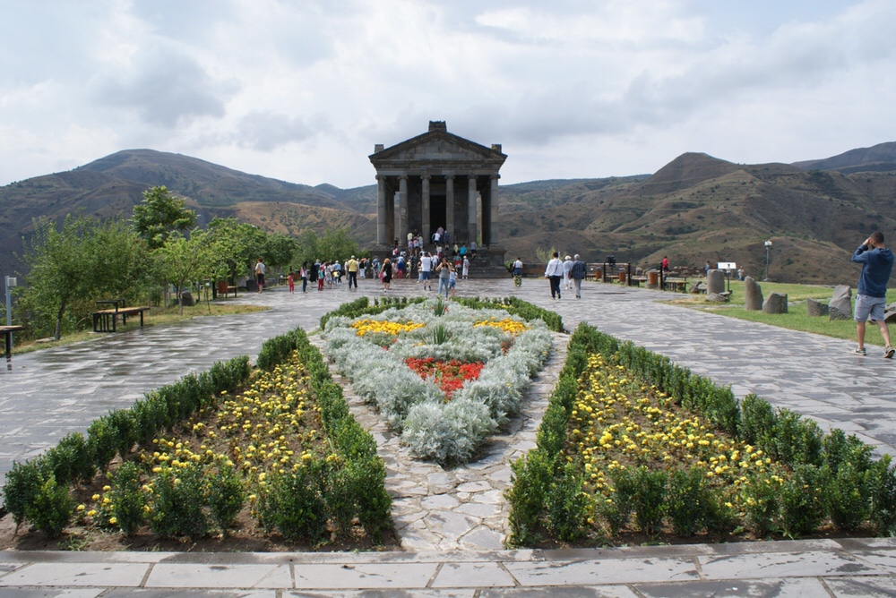 Garni é uma excepção à paisagem arquitectónica arménia. É um tempo helénico dedicado a Mitra, o Deus do Sol pagão, e foi construído pelo rei arménio Trdat I no século I. Dois factores não mudam, porém. A sua elegância e localização certeira, no topo de um desfiladeiro que vai vendo passar o rio Azat.