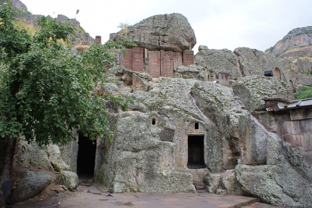 O desfiladeiro continua, embora não tão pronunciado, e uns quantos quilómetros adiante chegamos ao Mosteiro Geghard. Distinguido pela UNESCO como património da humanidade, este complexo monástico está em parte esculpido na rocha da montanha que o enquadra. Se olharmos bem em volta do mosteiro vemos até umas covas na dita montanha, correspondentes às antigas celas dos monges. Geghard terá sido fundado no século IV, embora a igreja Surp Astvatsatsin seja do século XIII. O seu interior, escuríssimo, é rico em esculturas nas paredes, desde animais a cruzes, e o gavit, o espaço largo de entrada, cheio de arcos. A acústica é incrível. E a água corre aqui dentro e diz-se que é água benta, adensando o ambiente de mistério. Na fachada da igreja encontramos também outros trabalhos esculpidos e por todo o recinto magníficos khachkars.