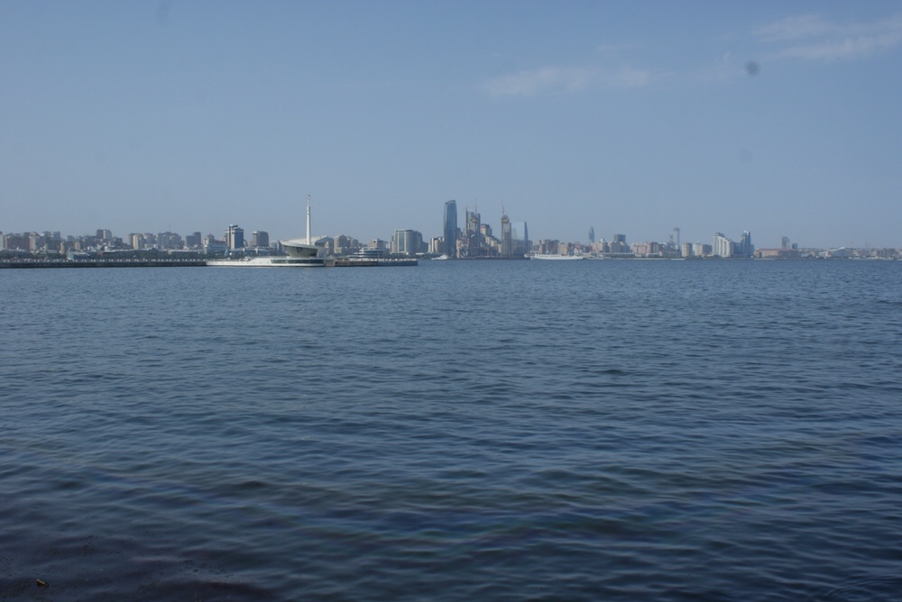 Uma torre do petróleo ergue-se como monumento representativo da principal economia da cidade. Curiosamente, deste canto da baía não se percebe a azáfama da actividade petrolífera e esta nem sequer é assim tão marcante na paisagem. Só bem mais adiante, já passados a Little Venice, excentricidade de gôndolas a passearem num canal artificial, e o novo edifício do Museu da Carpete, em forma de torta de laranja, é que se vê que as águas do Cáspio estão sujas de manchas de óleo e se sente um pouco esse cheiro. O bulvar continua, parece que até ao infinito e mais além.
