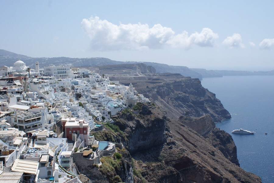 A beleza de Santorini não está na paisagem natural da sua terra. A principal ilha é conhecida como Thira e esta ilha de origem vulcânica é um autêntico rochedo agreste em toda a sua costa ocidental, chegando os penhascos a tomar 300 metros. Acontece que esse rochedo fica virado para um mar incrivelmente bonito a qualquer hora do dia, terminando com os tais pores-do-sol mágicos, e possui umas vilas absolutamente tocantes.