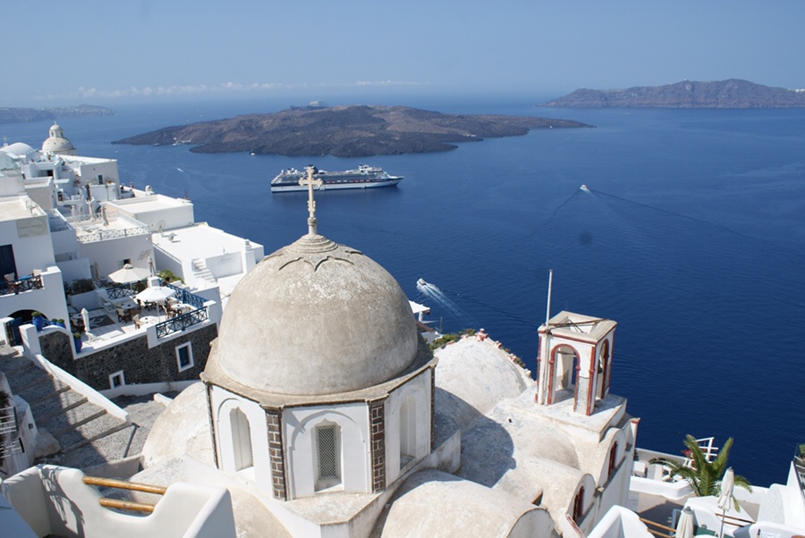 As várias igrejas que nos aparecem no caminho são apenas mais um adereço para tamanho encantamento. Elas lá estão, com as suas cúpulas azuis tradicionais numa linda parceria com as casas brancas que as rodeiam. Ou podem ser elas próprias alvíssimas. Ou até tomar cores em tom pastel. Tanto faz, são sempre belíssimas nesta paisagem idílica.