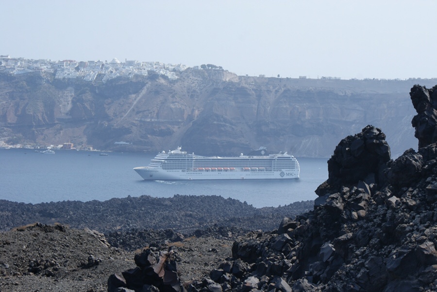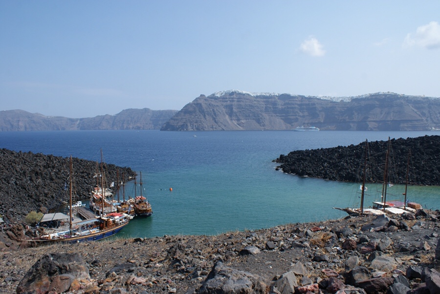O barco atraca numa pequena enseada e descarrega os turistas que empreendem uma curta caminhada até ao centro da cratera por um cenário pouco comum, um deserto rochoso e poroso onde ainda se vêem fumegar umas fumarolas. Por ora o vulcão está adormecido. Mas mais marcas da sua actividade sentem-se ainda nas águas extremamente quentes a amareladas do enxofre próximas do ilhéu Palea Kameni.