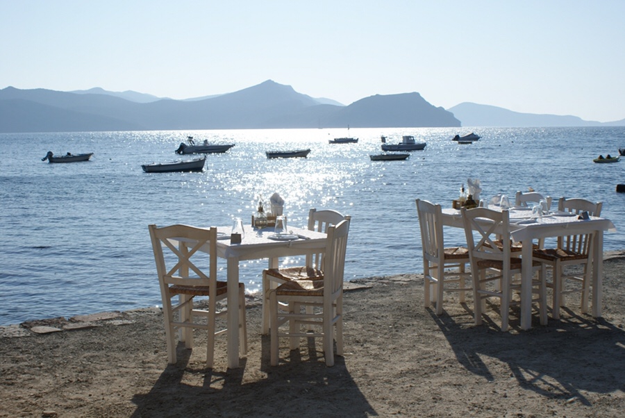 É forçado considerar Agios Konstantinos, perto de Pollonia, como uma aldeia. É antes um lugar com menos de uma dezena de casas com porta para a água numa enseada quase fechada. Tão fechada e tão recatada que as senhoras ali ficam à conversa, uma na água a fazer os seus exercícios de caminhada, a outra a descascar batatas à porta de casa quase que com os pés na água.