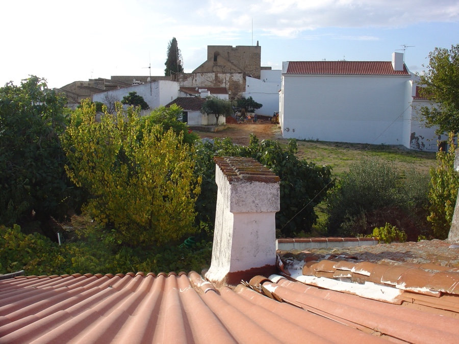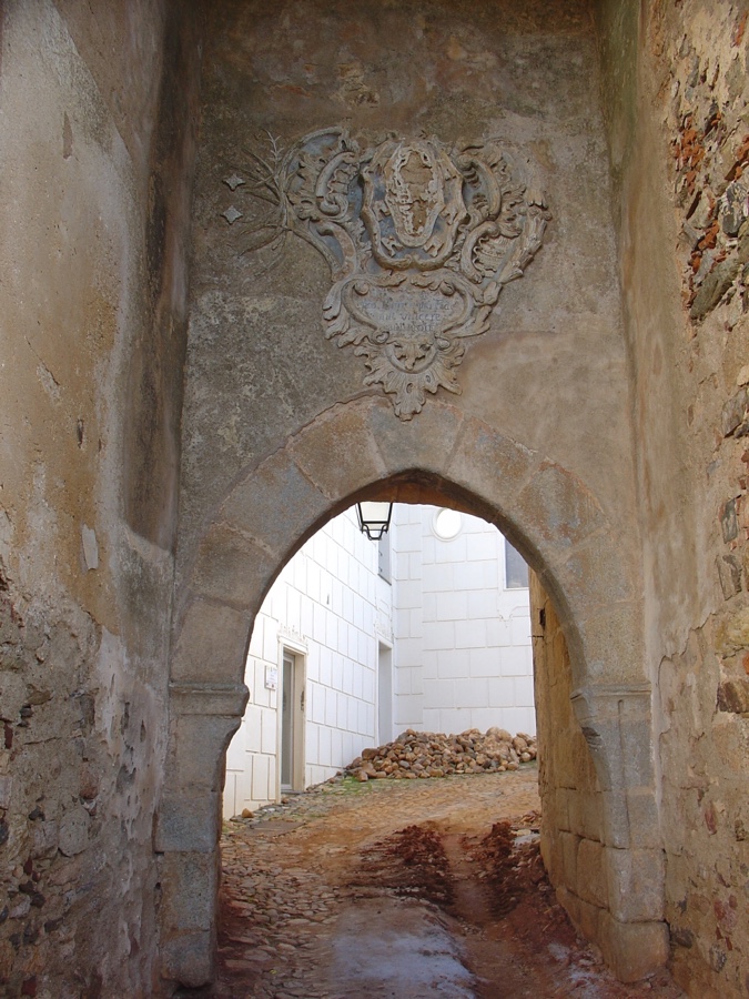 Mas para aí entrarmos temos de atravessar as duas portas em arco do castelo, encimadas por umas bonitas e ainda perceptíveis decorações do brasão de armas local. Após um percurso não linear junto às paredes da muralha, quase labiríntico, chegamos então à antiga praça de armas, o tal terreiro em obras. Ao centro, um poço correspondente à antiga cisterna permite ainda hoje aos habitastes retirar água. As suas poucas casas são brancas, com portas verdes, e com telhados ocres, como é da praxe alentejana.