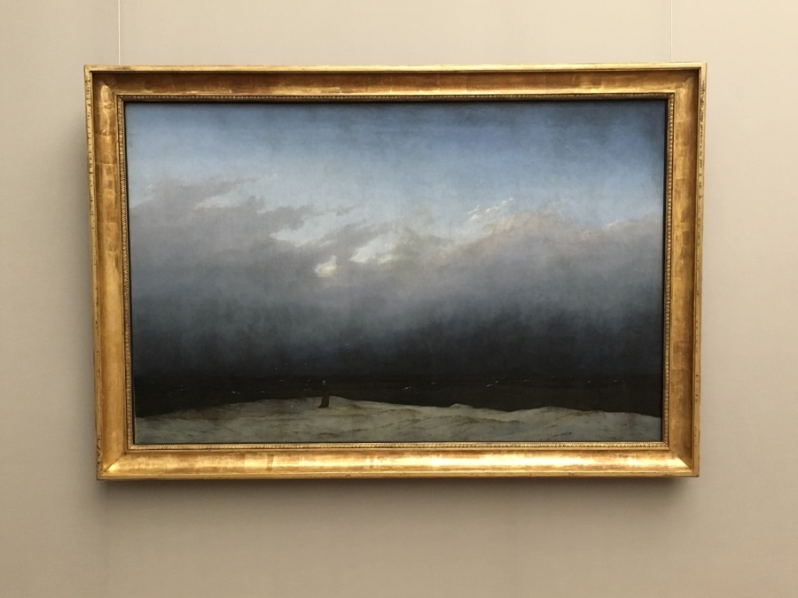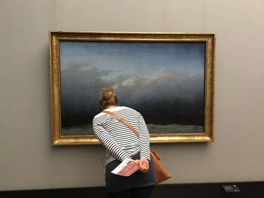 O interior do edifício, nomeadamente o seu hall de entrada, escadaria e hall do piso superior são muito bonitos. E as suas salas as ideais para mostrar as pinturas de Caspar David Friedrich com as suas paisagens de natureza românticas. Esta senhora tentou esconder o pequeníssimo monge de Caspar, mas não o conseguiu.
