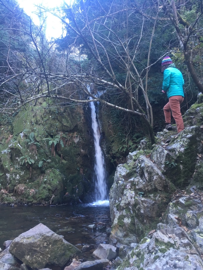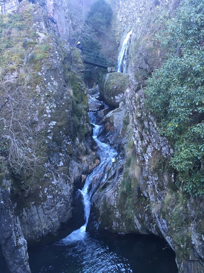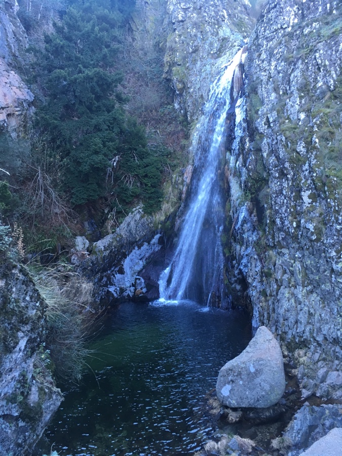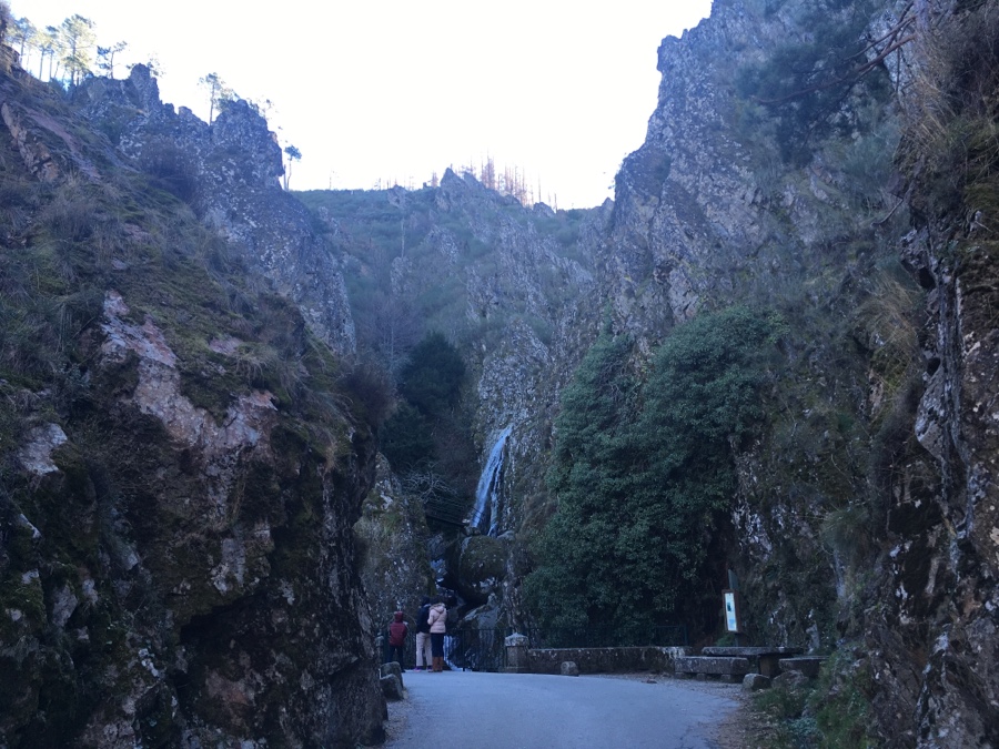 Estacionado o carro ao fim de uns 5 kms, seguimos pela estrada a pé mais uns metros e logo temos a cascata mesmo ali à beira. Estamos a 1080 metros de altitude e a água da Ribeira de Leandres, afluente do Rio Zêzere, despenha-se de uma altura de 10 metros, cortesia de uma falha na montanha. Podemos subir por umas escadas cravadas na pedra e chegar bem junto à água que jorra forte e barulhenta. Água tão cristalina que a curiosidade de observar uma das minhas mãos sob aquela transparência me deu coragem para a molhar. Como prémio segui a exploração do lugar com ela quase congelada.