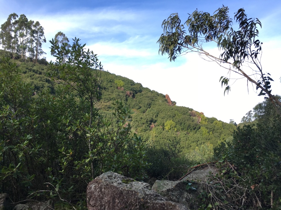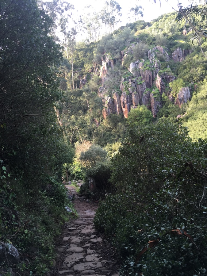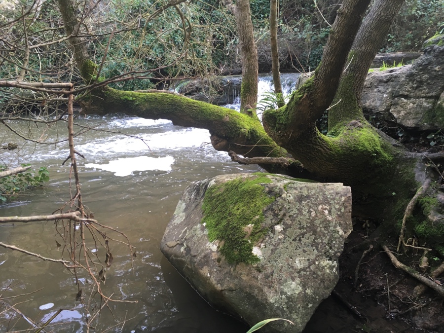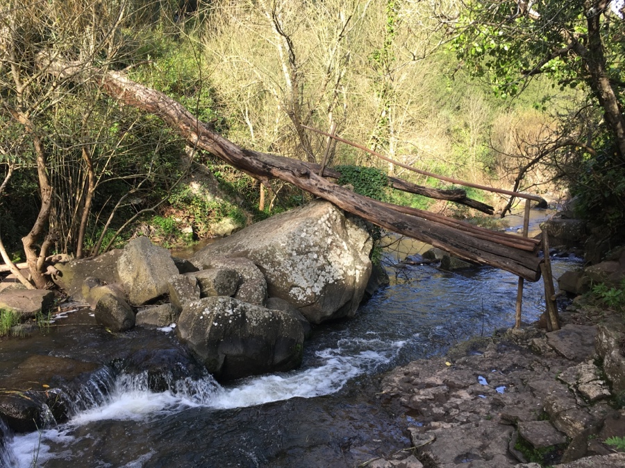 Um tronco no meio do caminho que o guarda-cascatas tornou transitável permite-nos atravessar a ribeira para o outro lado. Continuamos envolvidos pelo bosque e acompanhamos o percurso da ribeira sempre com o seu som como música de fundo. A água é fria, claro, bem guardada pela vegetação. Algures por aqui fica, desculpe o segredo, o frigorífico do Bigodes, um buraquinho na rocha perfeito para acondicionar uma garrafinha de tintol para se usar a qualquer altura do dia enquanto se relaxa neste recanto.