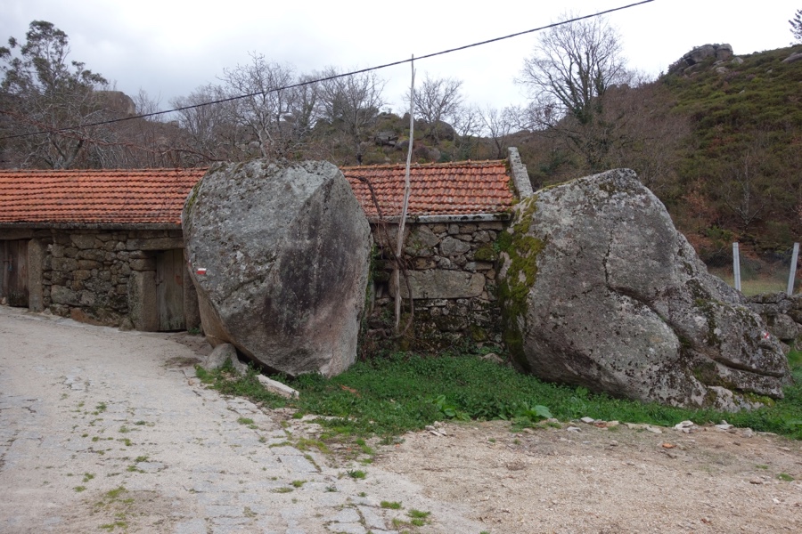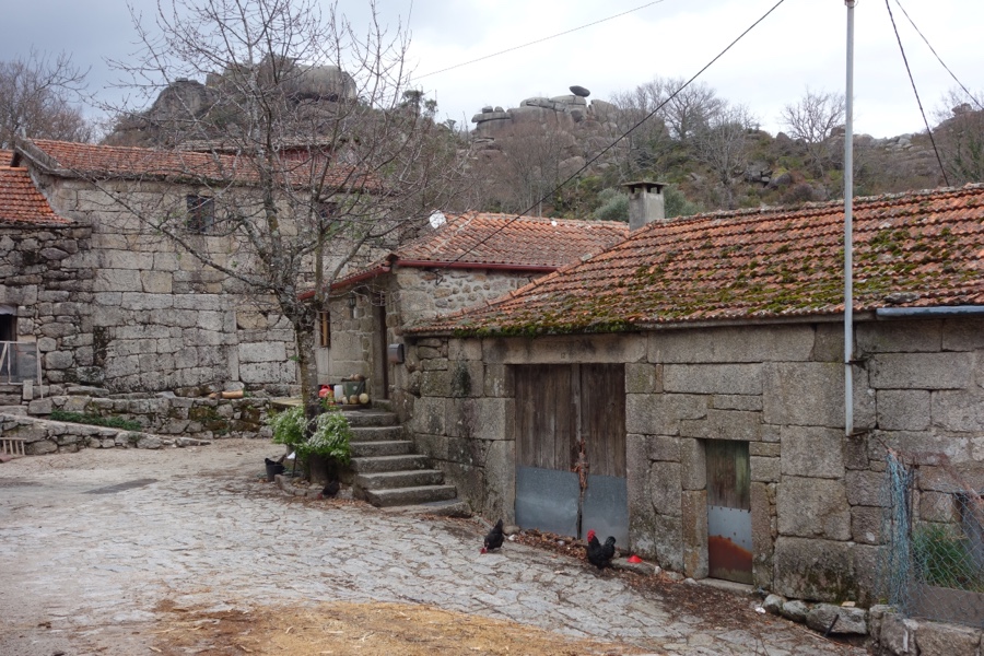 A volta à povoação faz-se num pulinho. As casas, de construção tradicional, são todas em pedra, excepção para os telhados em telha ocre, substitutos do já pouco usado colmo. Vemos os clássicos canastros. E vemos uns pedaços de terra verde, divididos e talvez prontos para o cultivo. Tudo isto guardado por formosos penedos.