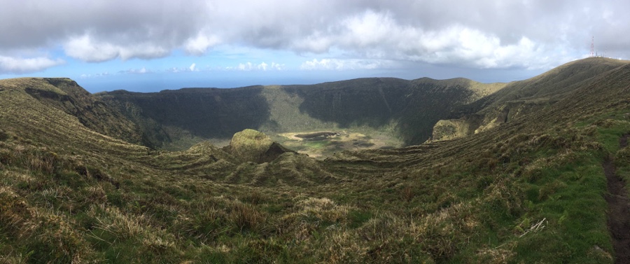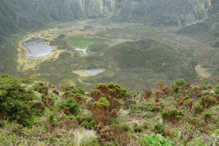 Lá em baixo (as visitas ao interior da Caldeira são possíveis, mas limitadas e apenas com guia), prados numa panóplia de tons verdes, a que se junta um jogo de sombras, preenchem o nosso olhar. Percebem-se ainda claramente pequenos charcos e até um pequeno cone vulcânico de uma erupção ocorrida posteriormente. A Caldeira é o mais importante reservatório biológico da ilha e é nestas alturas que lamento não entender nada de flora para conseguir distinguir os vários tipos de vegetação endémica que aqui marcam presença.