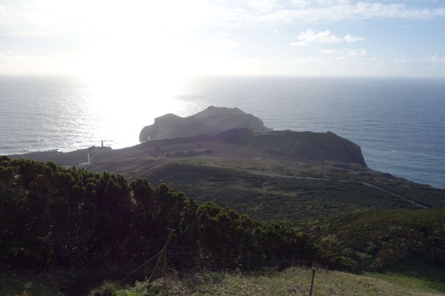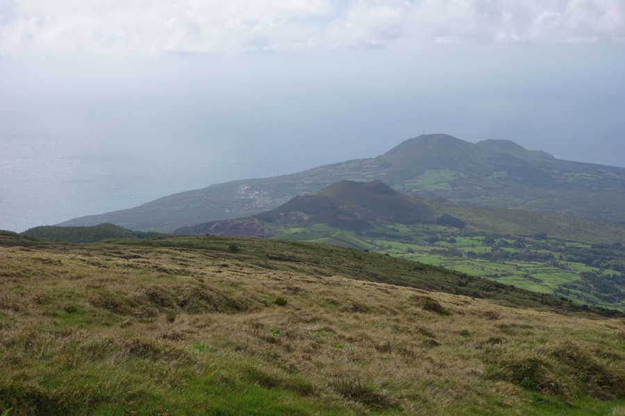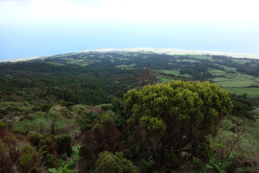 Por alturas do Alto do Cabouco o cume do Pico está agora totalmente coberto, mas pouco depois a costa norte da ilha deixa-se ver inteira e clara, numa bela parceria entre o verde e o azul. Raul Brandão chamou ao Faial “a ilha azul”, mas vista aqui de cima ficamos indecisos sobre qual a cor mais dominante.
