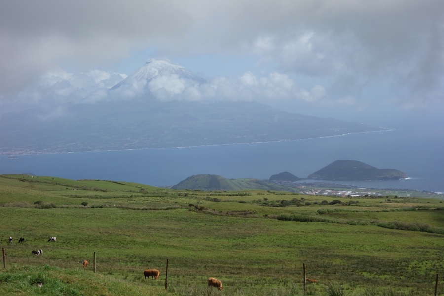 As vacas, símbolo incontornável dos Açores, deixam-se estar por estas paisagens altaneiras privilegiadas. Vemos o inigualável Morro do Castelo Branco lá em baixo e, de repente, felicidade suprema, eis a montanha do Pico descoberta bem à nossa frente. Com o Piquinho à mostra e tudo. E com o cume completamente branco, cheio de neve.