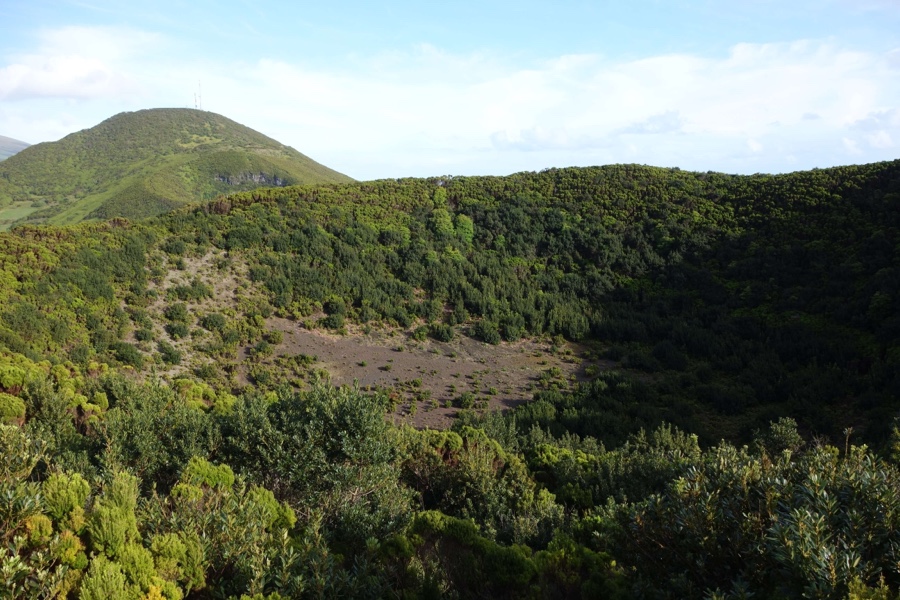 Já quase no final do trilho, passamos pouco abaixo do Cabeço Gordo, o ponto mais alto da ilha do Faial, a 1043 metros. Grande parte destes pontos até podem ser acedidos por carro, mas a piada de caminhar sempre em contacto com a Caldeira, como se ela estivesse ali só para nosso desfrute, perder-se-á.