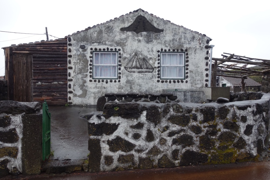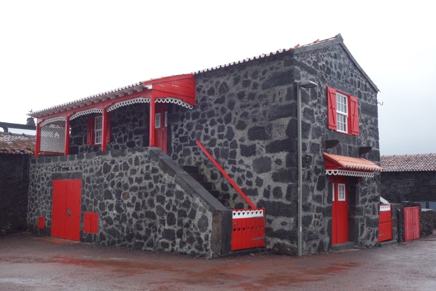 Comecemos este passeio pelo Lajido de Santa Luzia, povoação plantada à beira mar. Para além da omnipresente e omnipotente pedra, eis dois outros elementos que costumam acompanhar as vinhas do Pico: povoações e mar (mas há-as também no interior da ilha e fora das povoações; acontece que a região distinguida pela Unesco é exclusivamente costeira e é no litoral que a maior exposição solar e baixa humidade resultam em microclimas mais favoráveis ao cultivo da vinha). No Lajido podemos conhecer uma pequena povoação feita de casas de pedra negra bem preservadas. Então, mas se a ilha é feita de pedra negra e as casas das povoações de pedra negra são feitas, qual é a piada da coisa? Pode o negrume seduzir? Pode pois. Acontece que por entre a pedra negra de basalto das casas, em quase todas elas encontramos elementos que lhes dão uma vivacidade única e as tornam verdadeiramente pitorescas. Seja um alpendre a vermelho, um caixilho da janela a azul, um portão a verde, o branco malhado no preto que as reveste ou até a decoração de um barco na fachada. Tudo isto no meio do, lá está, negrume da pedra, incluindo a beira mar feita de lava.