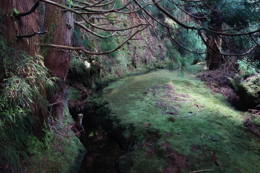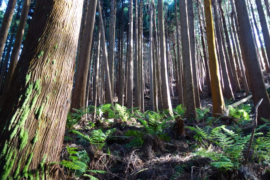 Uma das partes mais bonitas deste percurso aparece com pouca demora: uma floresta de cryptomeria japonica. Os troncos destas árvores são fantásticos, alguns deles tomando a forma de bengalas invertidas. Outros, com formas mais comuns, dão-nos na mesma uma imagem belíssima, todos próximos uns dos outros e bem altos. Nesta zona passa um ribeiro e existem algumas partes mais encharcadas, pelo que há que ter atenção onde colocar os pés para não escorregar. Vêem-se umas pontes nesta mata, o que aumenta a fantasia do cenário.