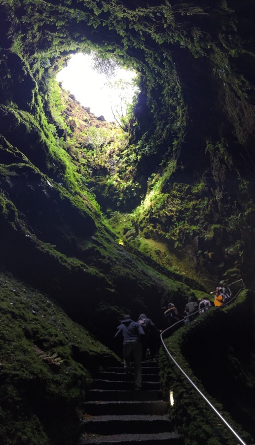 Um cabeço revestido de uma intensa vegetação recebe-nos mas à partida não lhe descobrimos nada de diferente. Mas após uma portinhola a servir de entrada seguimos por um túnel e entramos num mundo novo. Uma galeria no interior do dito cabeço fica diante nós. Descemos uma longa escadaria e o ambiente torna-se mais frio e húmido, com as gotas da água a escorrer pelas paredes rochosas. Estamos, então, dentro do vulcão e olhando para cima vemos a sua chaminé aberta ao céu. No negrume, um toque de verde dado pelas diversas espécies vegetais.