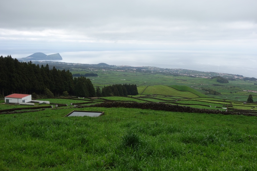 O cimo da Serra de Santa Bárbara é constituído pelo que foi outrora um vulcão. As nuvens cerradas não o deixam perceber, mas depois de descermos e voltarmos no caminho em direcção ao centro da ilha, em grande parte ocupado pela caldeira de Guilherme Moniz, temos oportunidade de perceber a quantidade de picos correspondentes a antigos vulcões que pululam por aqui. Curiosamente, nesta ilha relativamente pequena, a parte ocidental é acidentada, cheia de montes, enquanto que a parte oriental é quase toda ela plana, ocupada pelas famosas mantas de retalhos.