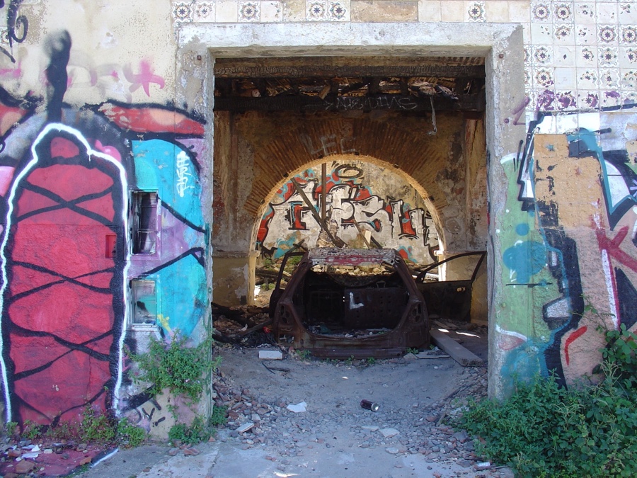 Não arrisco entrar nos edifícios, levando muito a sério os avisos de perigo de derrocada. Da porta escancarada de um deles vê-se um carro em ruína, como as paredes e o tecto que (não) o abrigam.