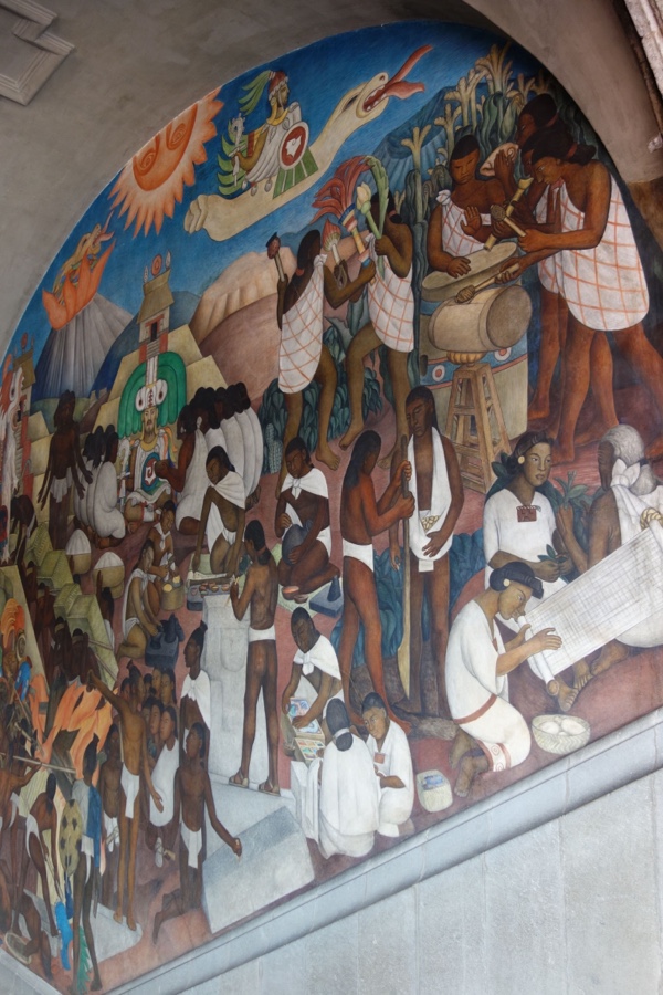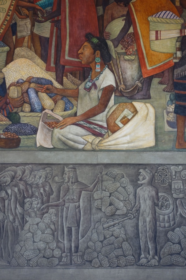No piso superior deste Palácio encontramos ainda mais uma série de belos murais também de Rivera, pintados entre 1941 e 1951, com o título de “O México Colonial e Pré-Colonial”. Aqui é representado o dia-a-dia das culturas pré-hispânicas e a Conquista do México por Hernán Cortés. Interessante apreciar a técnica aqui usada, com o mural colorido acima e um friso decorado com materiais mais tradicionais na parte mais baixa. O milho é figura quase constante nos murais de Rivera, como alimento primordial desde sempre. No México há, aliás, um dito eloquente: “Sin maíz, no hay país”.