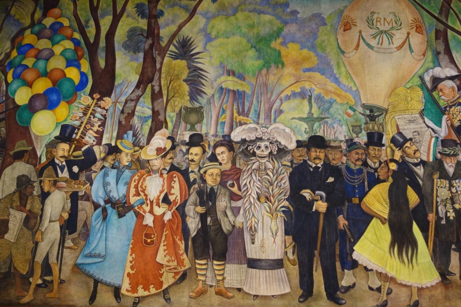 Realizado originalmente para o átrio de entrada do Hotel del Prado, “Sonho de uma tarde de domingo na Alameda Central”, de 1947, é uma representação da história do México a desfilar pelo cenário da Alameda Central, zona de passeio e lazer do centro histórico da capital mexicana. Em 15 metros parecem caber todas as personagens que construíram a história do México. O próprio Rivera representa-se a si mesmo por duas vezes, em miúdo, de mão dada com a Caveira Catrina, e em mais velho. Frida está uma vez mais presente, precisamente entre o miúdo e a caveira, com o símbolo yin-yang numa das suas mãos.