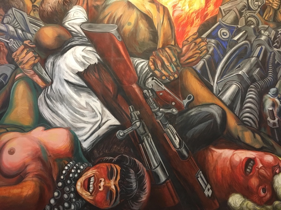 Mas as imagens mais brutais e expressivas vêm da arte de Siqueiros. São cinco os seus murais aqui presentes, mas recordo mais vivamente a mulher ruiva que se liberta das correntes como representação da vitória da democracia sobre o jugo alemão no final da II Grande Guerra Mundial. Este mural tem o título “Nova Democracia” e a seu lado estão os também poderosos “Vítimas da Guerra” e “Vítimas do Fascismo”, todos realizados em 1945.