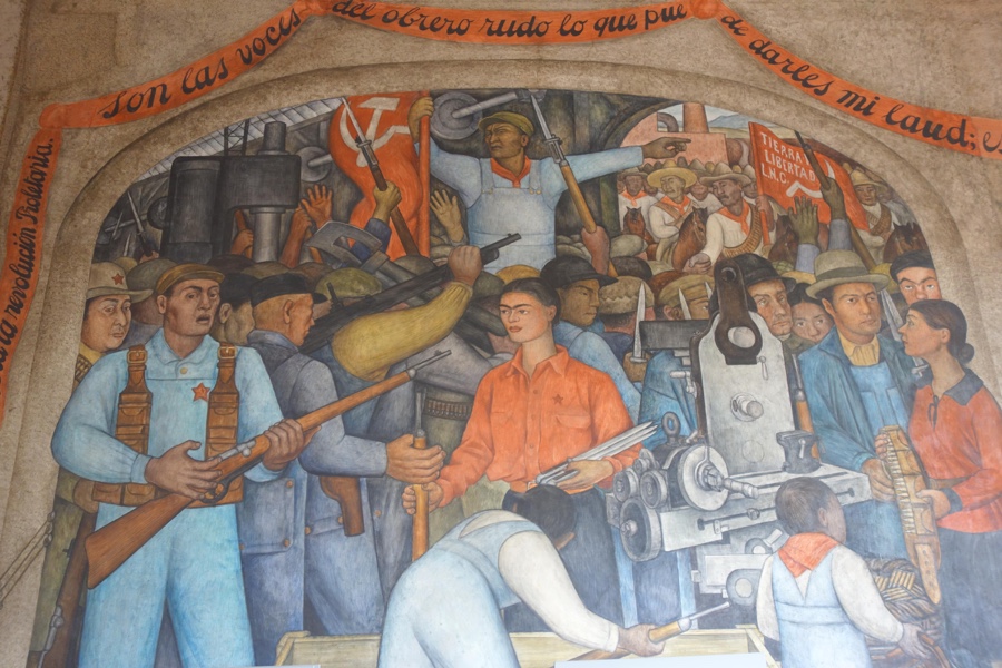 Frida, claro, também pode ser encontrada num dos murais, de estrela vermelha ao peito distribuindo armas aos trabalhadores, por baixo da bandeira do Partido Comunista, para que lutem. Num outro mural uma homenagem a grande nomes da cultura internacional, como Tagore.