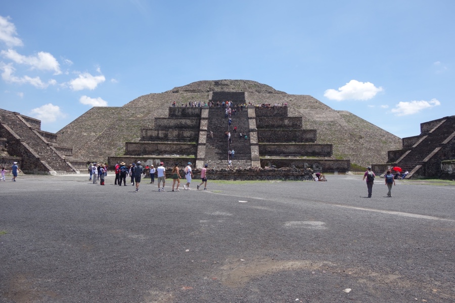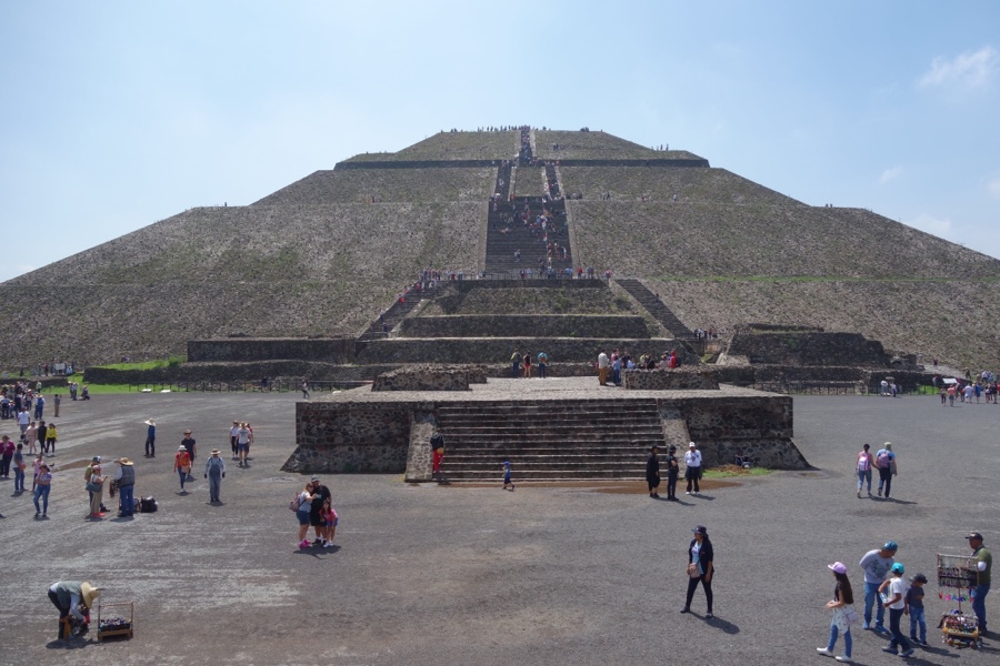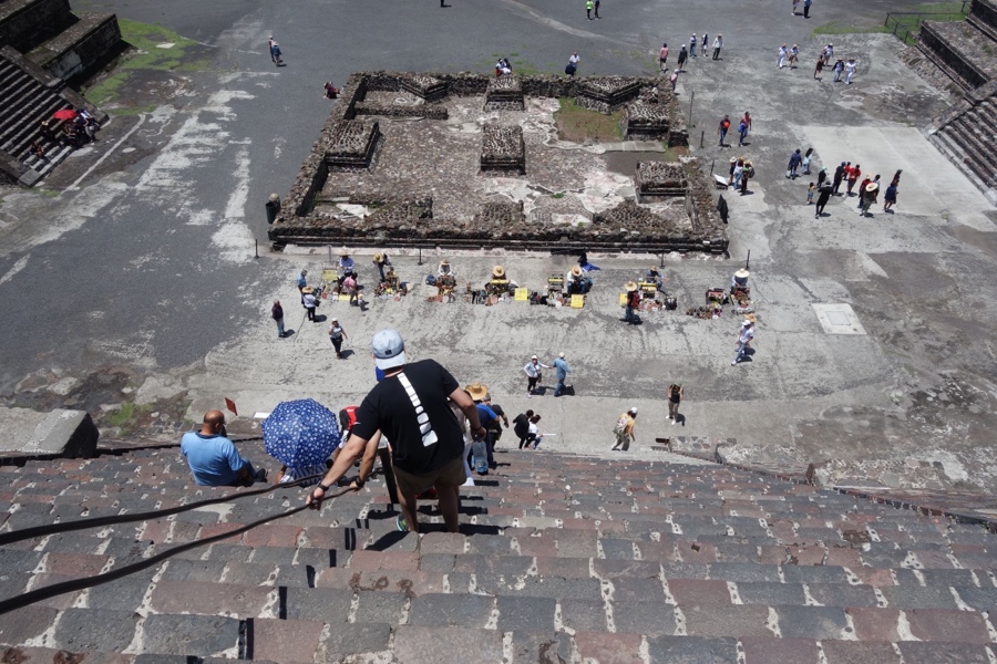 Subir ao topo da Pirâmide do Sol não é tarefa fácil, quer pelo calor, quer pelos degraus – 248 – estreitos e muito inclinados. Para piorar, estamos a uma altitude de 2300m. Mas qualquer esforço para vencer os últimos degraus é recompensado por uma vista fabulosa de todo o vale e cidade antiga, de um lado o Templo de Quetzalcoatl, do outro a Pirâmide da Lua e, pelo meio, a Calzada de los Muertos ali em baixo, inteira, em toda a sua extensão já escavada. Do alto dos 70 metros da Pirâmide do Sol parece que o ar se torna, como que por magia, menos rarefeito e uma espécie de iluminação toma conta de nós. É um ambiente incrível e só é pena que o tenhamos de dividir com magotes de colegas turistas que querem tirar a foto da praxe.