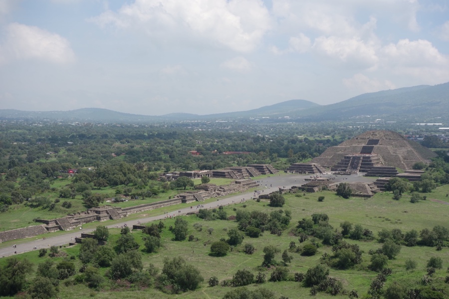 Entrando pela sua Porta 1, a sudoeste do recinto visitável, logo temos diante nós a Ciudadela e o Templo de Quetzalcóatl. Correndo para norte abre-se a Calzada de los Muertos, uma longa avenida hoje com 2 kms, mas que se crê ter tido pelo menos o dobro. No final da Calzada, ergue-se majestosa a Pirâmide da Lua e antes dela, ainda maior, a Pirâmide do Sol. Eis todos os grandes elementos urbanístico-arquitectónicos que Teotihuacan nos legou e que os arqueólogos têm vindo a explorar e estudar desde o início do século XX, data até à qual se pensava que os edifícios cobertos de terra e vegetação que aí estavam não fossem mais do que pequenos montes.