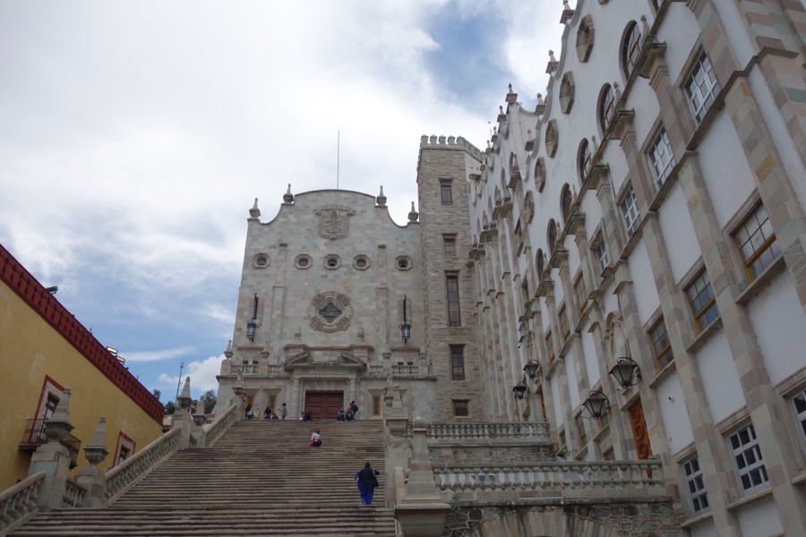 O outro ícone da cidade é o edifício central da Universidade de Guanajuato. Construído nos anos 1950s, não é ainda hoje uma unanimidade. É inegável a ruptura arquitectónica que cria quando visto ao longe, do Monumento a Pípila por exemplo, uma enorme massa branca luminosa que parece destoar do amontoado colorido dos edifícios coloniais ou casas mais modestas. Mas quando visto ali mesmo, no seu lugar, já parece não destoar assim tanto. Pelo contrário, a sua escadaria monumental (quase 100 degraus) e a sua fachada com elementos renascentistas e neogóticos, que quase chega a parecer um castelo medieval, fazem deste conjunto excêntrico um momento feliz.