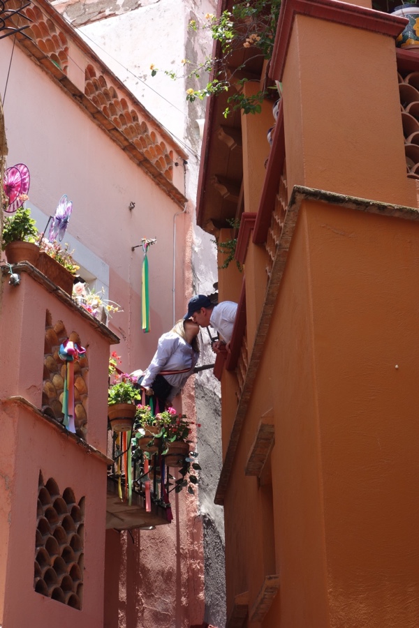 Um pouco mais adiante aparece a Plaza de Los Angeles com as suas escadarias que cercam uma fonte e as suas casas coloridas. É desta praça que se sobe até ao Callejón del Beso, uma daquelas tretas para turista ver, uma rua estreita onde duas varandas quase que se tocam que, conta a história, serviu de cenário para o amor tormentoso entre uma filha de boas famílias e um mineiro, que, vizinhos, aqui trocavam beijos furtivos.