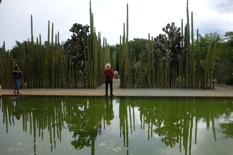 E lá em baixo fica o Jardim Etnobotânico, antiga horta do Convento. A visita a este jardim é apenas efectuada em determinados horários e com um guia (prevê-se que em breve possa vir a ser de visita livre, embora igualmente paga). Os poucos horários disponíveis para a visita não devem deter-nos, uma vez que este é um dos mais fantásticos locais que a cidade tem para oferecer. A ideia do jardim tem vindo a ser posta em prática a partir de 1998, quando se começaram a plantar plantas de todo o estado, neste que é o estado do México com mais espécies. E porque as plantas escolhidas para aqui serem representadas possuem também um significado cultural, eis o nome do jardim: etnobotânico. Vemos muitas espécies diferentes, incluindo os omnipresentes cactos, sempre num ambiente exótico, incluindo o pequeno lago com os reflexos irreais das plantas.