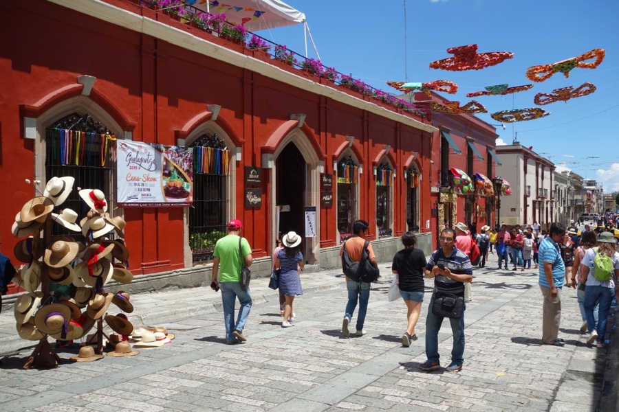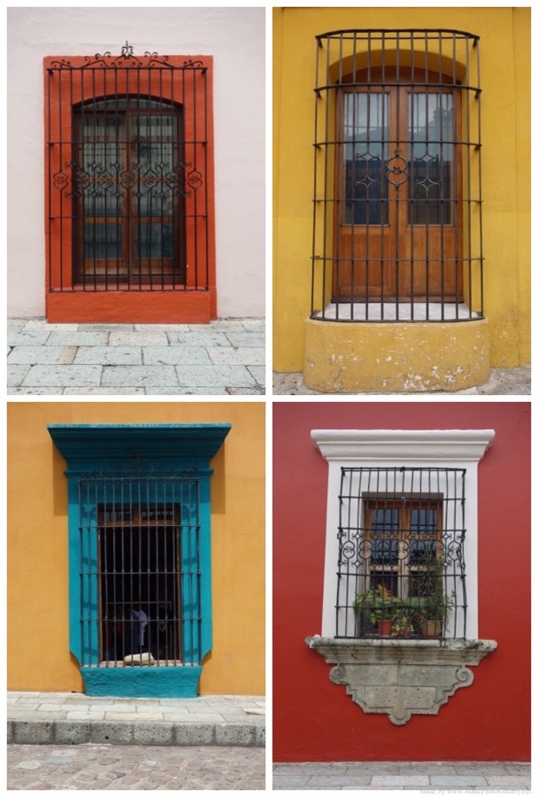 A Calle Macedonio Alcalá segue do Convento de Santo Domingo à Catedral no Zócalo. Rua pedonal, de um lado e do outro desfilam os edifícios coloridos coloniais que fazem também a fama de Oaxaca. Igualmente, nas ruas que lhe são paralelas e perpendiculares descobrimos muitos pormenores de encantar, seja uma cor diferente, uma janela decorada com flores ou uma janela que de tão longa mais parece uma porta, até um grafitti perdido numa parede.