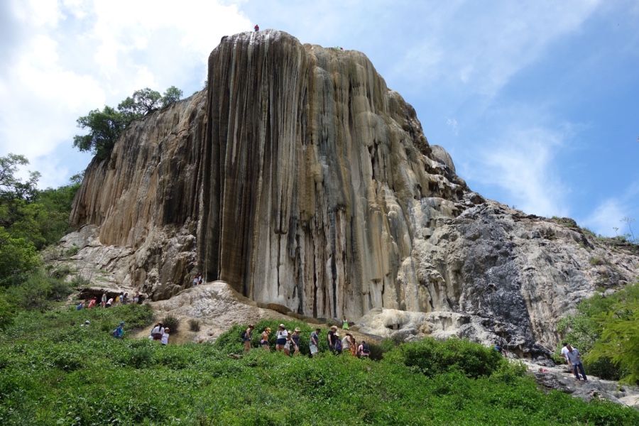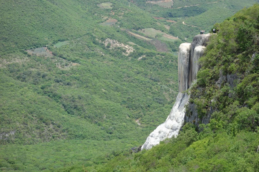 De Mitla seguimos até Hierve el Agua e pelo caminho fomos apreciando a paisagem montanhosa. “Ferve a agua” é um lugar que tem tudo para ser um daqueles panoramas incríveis que se guardam na memória até ao final da vida – uma piscina de água azul debruçada num desfiladeiro acompanhado pelo recorte da montanha. Acontece que em época de Guelaguetza não é só a cidade de Oaxaca que está cheia de visitantes. É também toda a região. Ou seja, à nossa passagem o panorama incrível estava transformado num cenário preenchido por uma multidão de corpos e cabeças que quase não deixava perceber que ali havia uma piscina com água. Este é, pois, um lugar popular.