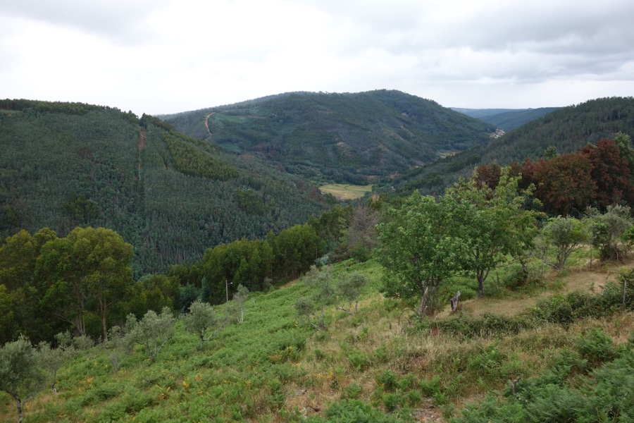 A paisagem deste pedaço da Serra da Lousã também não difere muito da da outra vertente. Para além dos cada vez mais frequentes pinheiros e eucaliptos, ainda se encontram bosques de castanheiros e carvalhos e nas zonas ribeirinhas azereiros e azevinhos. Mas nesta zona dominam de forma arrebatadora os Penedos de Góis, dos pontos mais altos da serra, com 1043 metros. Esta é uma paisagem mais agreste e também o clima junto a eles é menos certo. A mim tocou-me um dia a bater à porta da época do Verão onde o céu não se chegou a ver.