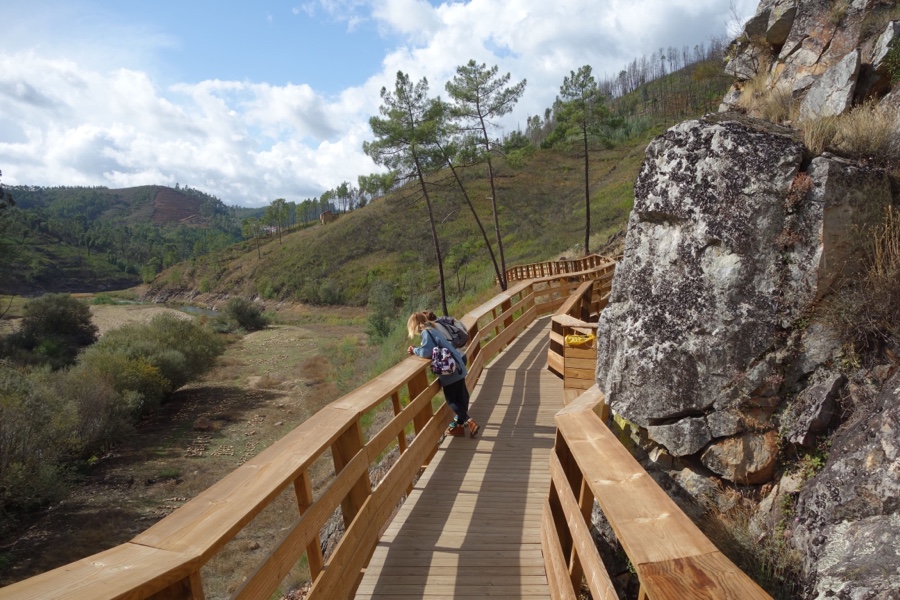 Aqui começam uns dos mais recentes passadiços no nosso país. Por enquanto são apenas 532 metros lineares, mas a Câmara Municipal de Vila de Rei pretende alargar o percurso de forma a torná-lo circular. Podem ser poucos metros mas cada um deles merece a pena ser pisado com leveza de forma a melhor se apreciar a paisagem que os rodeia. Rochas selvagens envolvem-nos ao mesmo tempo que um fio de água da Ribeira de Codes corre sem pressa até ao encontro da alfubeira de Castelo de Bode, logo ali ao fundo.