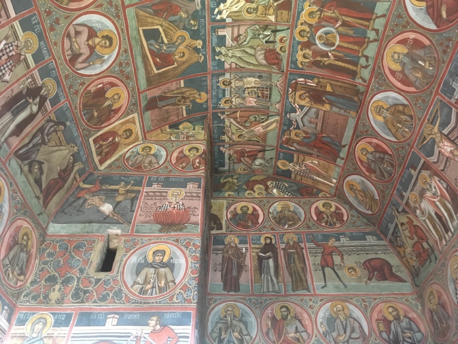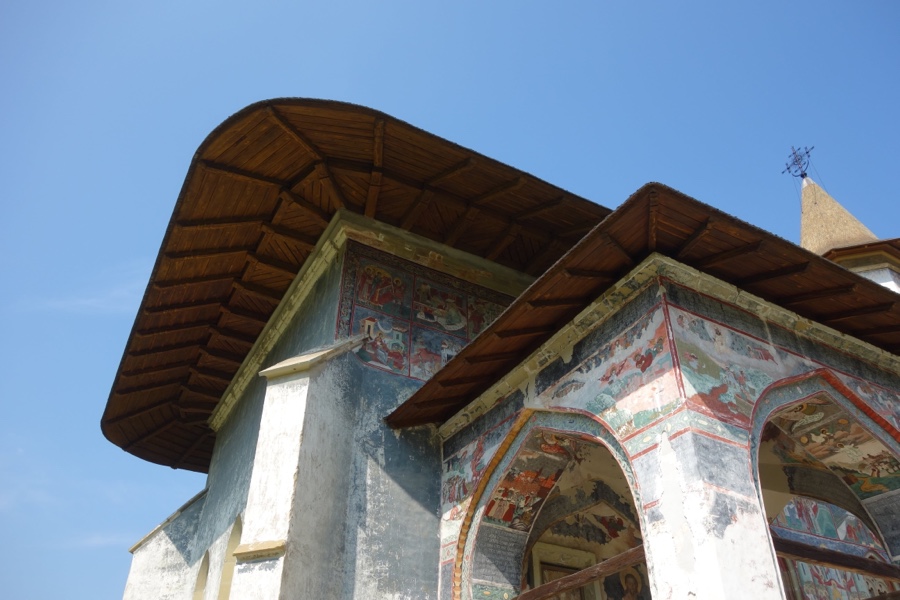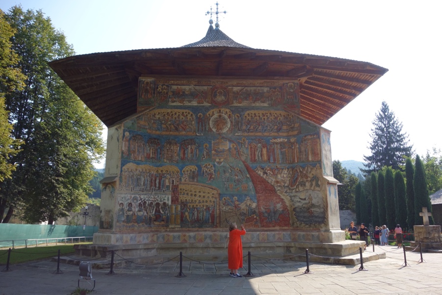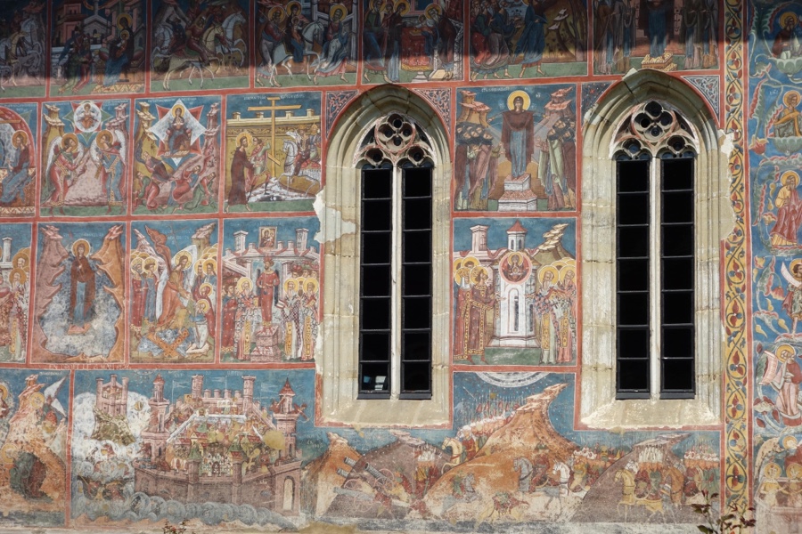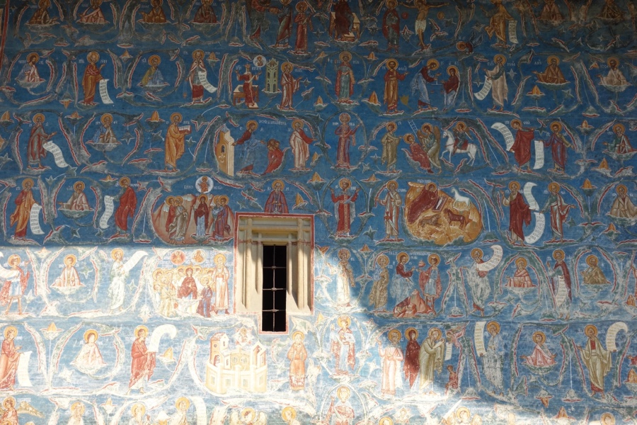 E são oito os Mosteiros Pintados de Bucovina distinguidos pela Unesco como Património da Humanidade: Arbore, Probota, Patrauti, St George, Humor, Voronet, Moldovita e Sucevita. Visitámos os últimos 5 e pudemos constatar como todos eles chegaram incrivelmente bem preservados desde a época medieval até aos nossos tempos, com as pinturas bem vivas. Cada um destes mosteiros está mais associado a uma determinada cor e as pinturas da sua fachada sul estão sempre mais bem conservadas do que as da fachada norte, cortesia dos ventos agrestes de norte. Todas as pinturas que admiramos nestes mosteiros foram apenas limpas e restauradas, mantendo-se os frescos originais, não tendo voltado a ser pintados. E cada um destes mosteiros está mais associado a um determinado motivo bíblico. Estas podem ser algumas diferenças, cor e motivos bíblicos, mas a motivação para a construção destes mosteiros e criação dos frescos foi a mesma: a de promover a religião cristã ortodoxa ao mesmo tempo que se procurava educar os iletrados, dando-lhes a conhecer a história da cristandade através das imagens das pinturas – daí as pinturas e o simbolismo nelas representado também nas fachadas exteriores, para que todos as pudessem ver e entender. Como resultado, a fé aliada à arte, marca identitária de toda uma região.