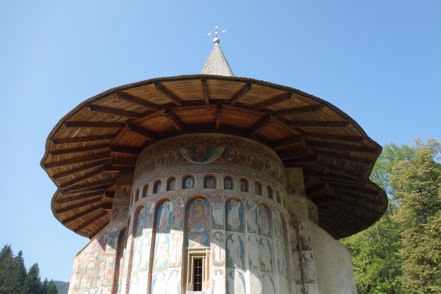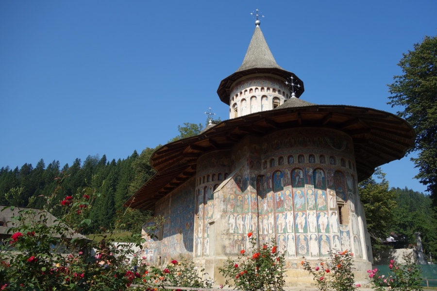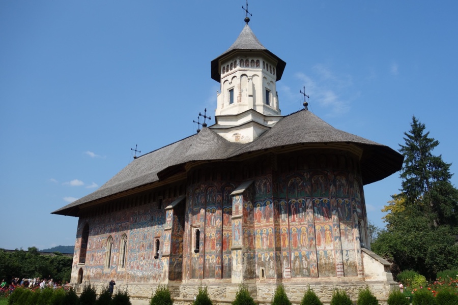 Mandada construir por Stefan, o Grande em 1488, há quem diga que esta é a mais famosa das igrejas romenas. O seu telhado parece um chapéu de elegantes abas, mas este é apenas o primeiro elemento que retém a nossa atenção. A obra de pintura da fachada exterior é considerada a Capela Sistina do leste. Na fachada oeste da igreja encontramos pintada uma incrível cena do Juízo Final, uma interpretação poderosa da Bíblia por parte de um artista completo, versado e talentoso não apenas na pintura, mas também um estudioso. A escolha desta representação do Juízo Final na fachada oeste não é alheia ao facto de ser aqui que o sol se põe, despedindo-se do dia, pretendendo-se assim que esta cena bíblica que representa o fim da vida esteja também associada ao fim do dia. Na fachada sul vemos representados diversos filósofos, como Aristoteles, Platão e Sócrates, o que não é assim tão comum em temáticas religiosas. O interior da igreja de Voronet é igualmente deslumbrante (como o de todas as outras igrejas visitadas). Decorado interiormente, de alto a baixo, temos a primeira sala do calendário, com 365 pequenas pinturas com alusão a factos e cenas de cada um dos dias, uma segunda sala com a história de São Jorge (o nome desta igreja) e uma terceira sala com o altar. Curiosamente, em Bucovina as igrejas possuem 3 salas, ao contrário das de Maramures que possuem apenas 2 salas, embora em ambas as regiões as igrejas sejam cristãs ortodoxas.