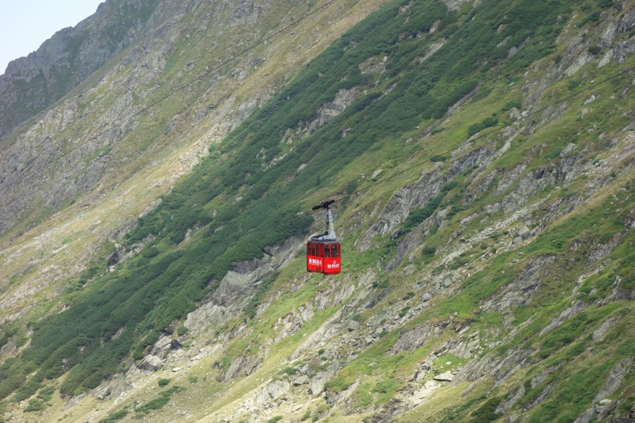 Chega, então, o momento de descer esta pista, igualmente a baixa velocidade pelos cotovelos apertados e pela vontade de fazer com que o tempo não passe. A cabine do teleférico vermelho voa sobre nós, rasgando o azul do céu rumo ao verde da montanha. A Cascata Balea está mais abaixo, perto da entrada da estação do teleférico, mais um lugar muito concorrido, e logo voltamos a ficar rodeados de floresta e em breve a Transfagarasan terminará.