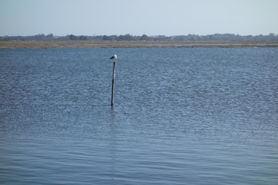Continuamos a pedalar até ao Cais da Cambeia e daí em diante entramos numa zona de esteiro, cheia de braços estreitos com vegetação rasteira na água. Não muito longe desta zona desagua o Rio Antuã.