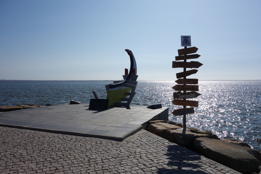 Mais adiante, a Ria não apenas como espaço natural mas também como espaço de lazer. Uns barcos atracados no cais, outros soltos numa pequena enseada de areia e um papagaio no ar a puxar um homem sobre uma prancha. Estas águas acompanhadas do vento local são ideais para o kitesurf, entre muitos outros desportos náuticos.