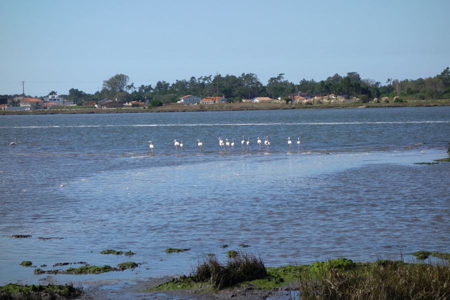 A natureza e as paisagens são grandiosas. De uma serenidade tocante. Os flamingos com as suas elegantes patas assustam-se, sem razão, à nossa passagem e logo abrem e fecham as suas asas vigorosamente, pintalgando de rosa o cenário com fundo azul. Esta foi a primeira imagem que nos tocou ao iniciar o trilho da Bestida e não mais a esqueceremos. Adoptámos os flamingos como mascotes do nosso passeio e sempre que os víamos parávamos e deixávamo-nos estar a contemplá-los em silêncio, para não voltar a perturbá-los.