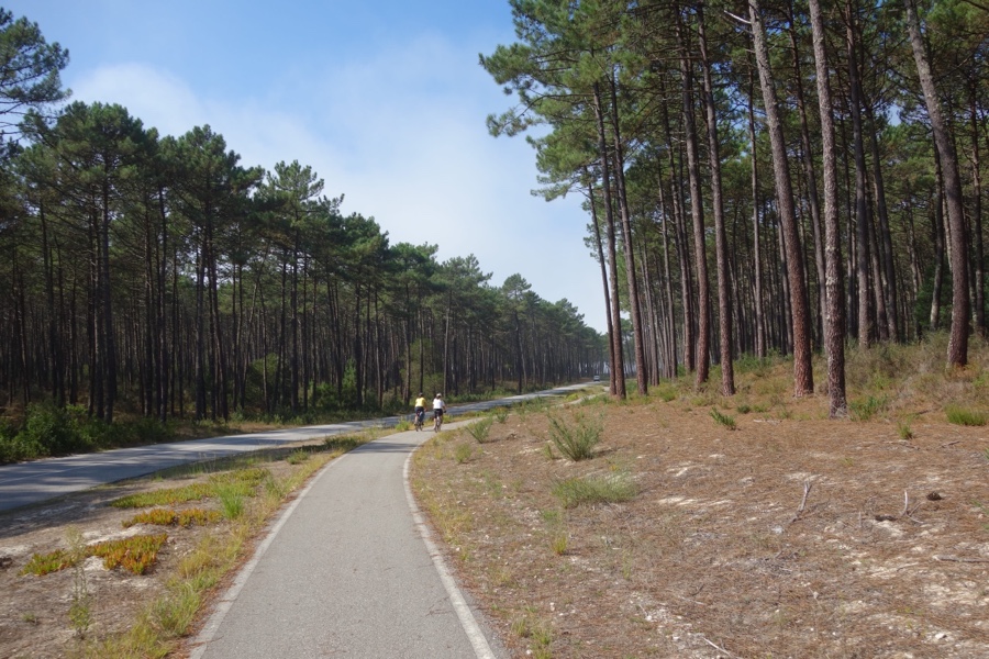 Até se chegar ao Canal de Ovar, já a cheirar a Ria de Aveiro, a Cicloria leva-nos a pedalar uma vintena de quilómetros por uma estrada no meio do pinhal, afastada do mar. Não sentimos o odor a maresia, mas o cheiro dos pinheiros não lhe fica atrás em sentimento. Chegados ao dito Canal de Ovar a água passa a acompanhar-nos à esquerda e na estrada chamam-nos a atenção os barquinhos típicos aí atracados e as bancas com as senhoras a vender fruta e legumes. Por ocasião da povoação Quintas do Norte atravessamos a ponte construída estrategicamente no ponto mais curto da Ria e iniciamos finalmente o passeio planeado pelos trilhos da Ria na Murtosa.