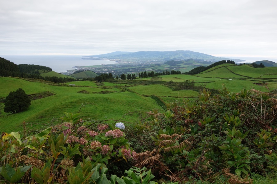 São Miguel é apodada de “ilha verde”. Há muitos anos (décadas, até) que não voltava e depois de ter passado por outras ilhas do arquipélago não entendia o porquê de ser esta a “ilha verde” se todas as outras estão carregadas de tapetes dessa cor. Mas, logo após sair do avião e sentir o cheiro a bosta, o segundo sentido vai por inteiro para a visão carregada do verde dos seus montes, vales e campos. Tudo é incrivelmente verde, até mais do que nas suas ilhas irmãs, aqui cabendo todas as tonalidades dessa cor possíveis e imaginárias.